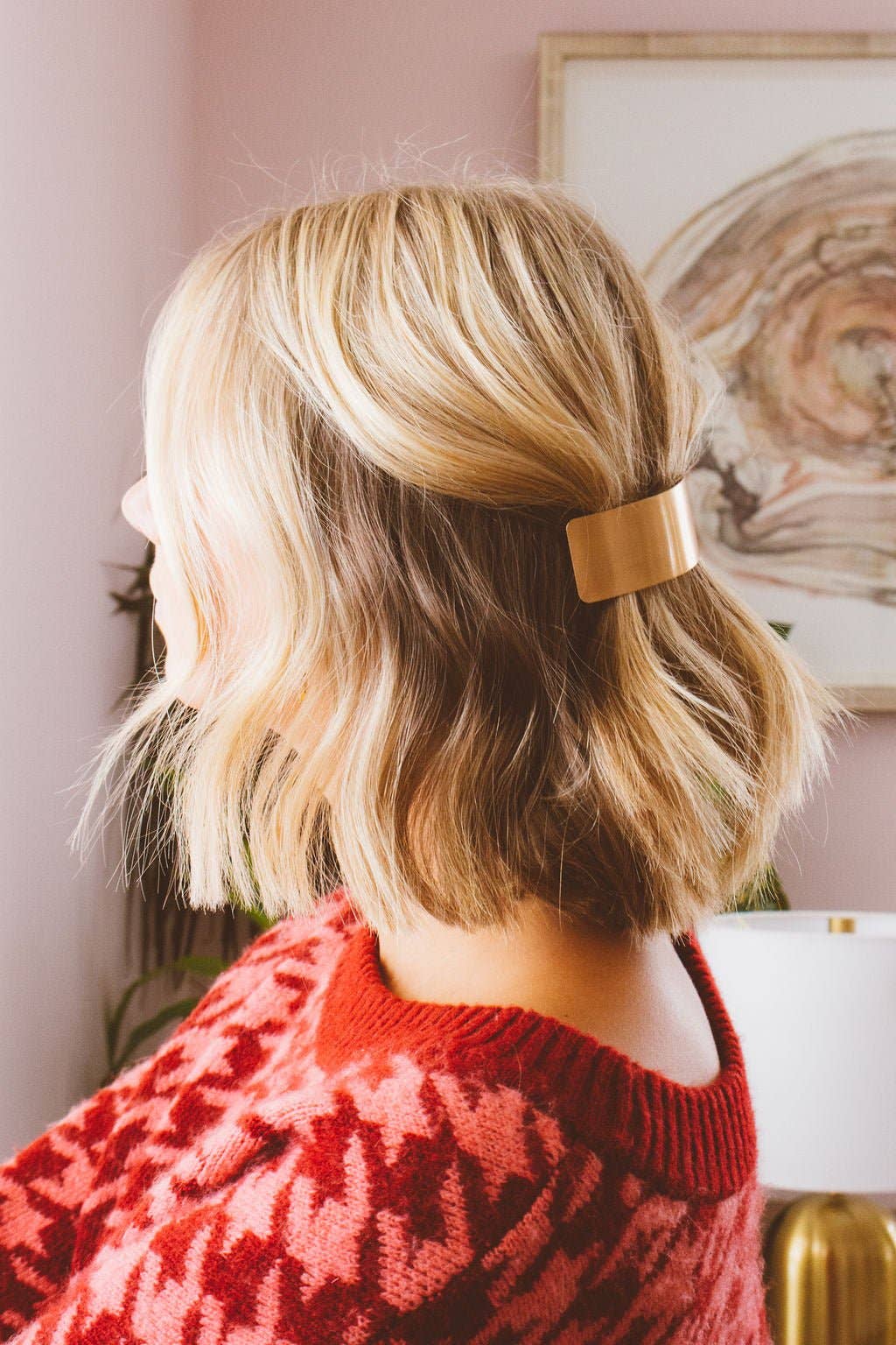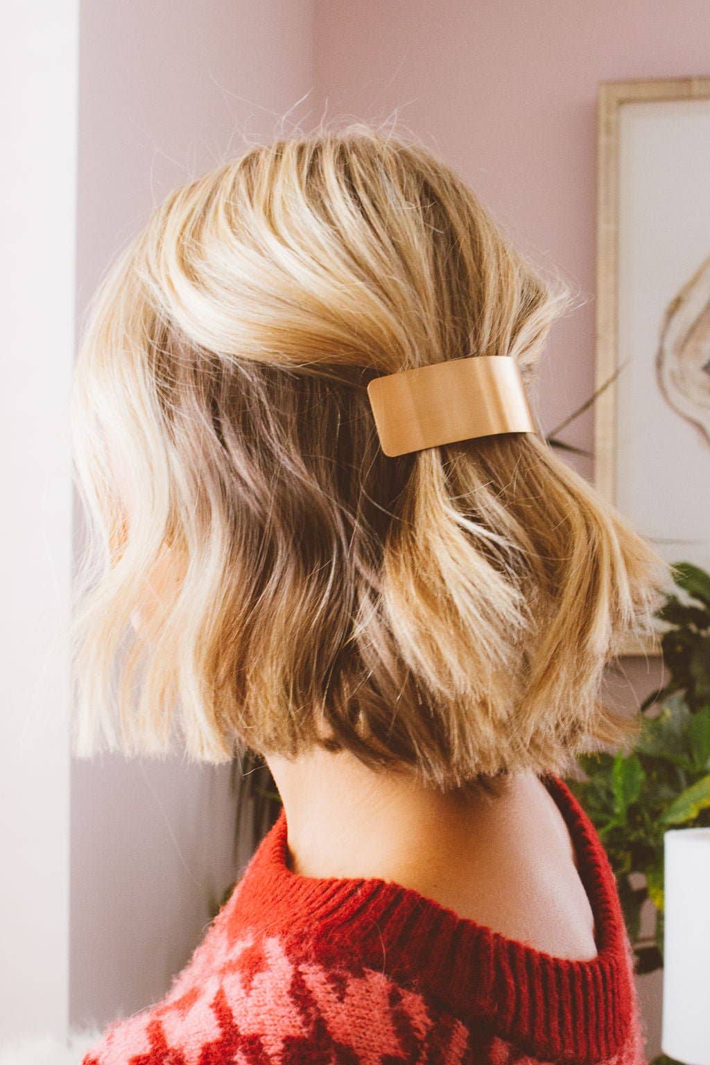 This gold bar clip is the perfect accessory when you're looking for something a little classier than a scrunchie! This clip is a french barrette clip style and is perfect in a half up like this or in a low pony! This one is a matte gold color that resembles as brushed bronzed style metal!