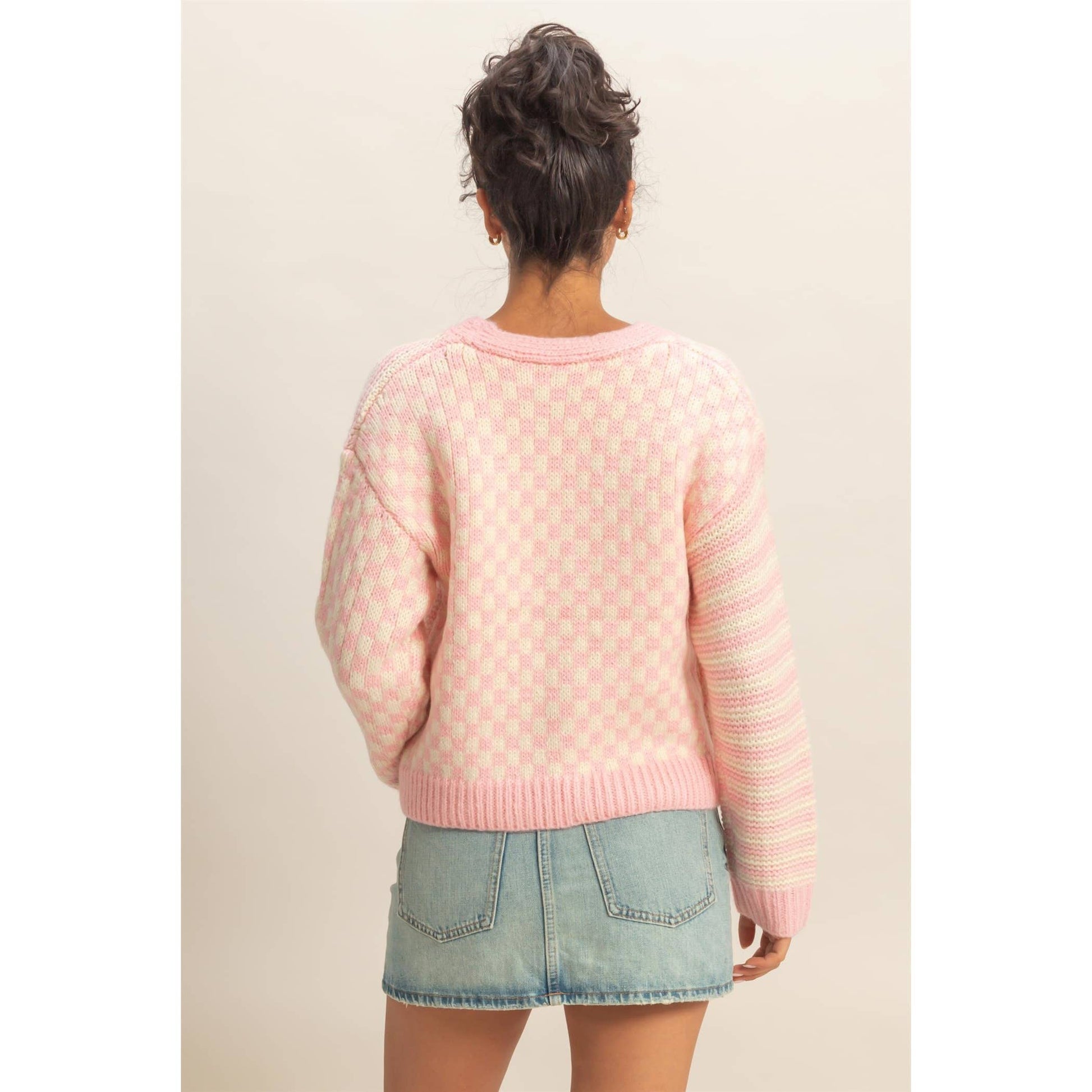 his cozy knit cardigan sweater features a checkerboard and striped patterns that bring a dynamic visual appeal. Perfect for transitioning seasons, it offers warmth and style in equal measure. Pair it with high-waisted jeans or a flowy skirt for a casual outing or layer it over a dress for a more sophisticated evening look. It's versatile and creates effortless ensembles. 50% Acrylic 50% Nylon Model Is 5' 7" Tall, 32" Chest, 25" Waist, 36" Hips And Wearing A Size Small Imported. Designed In The USA