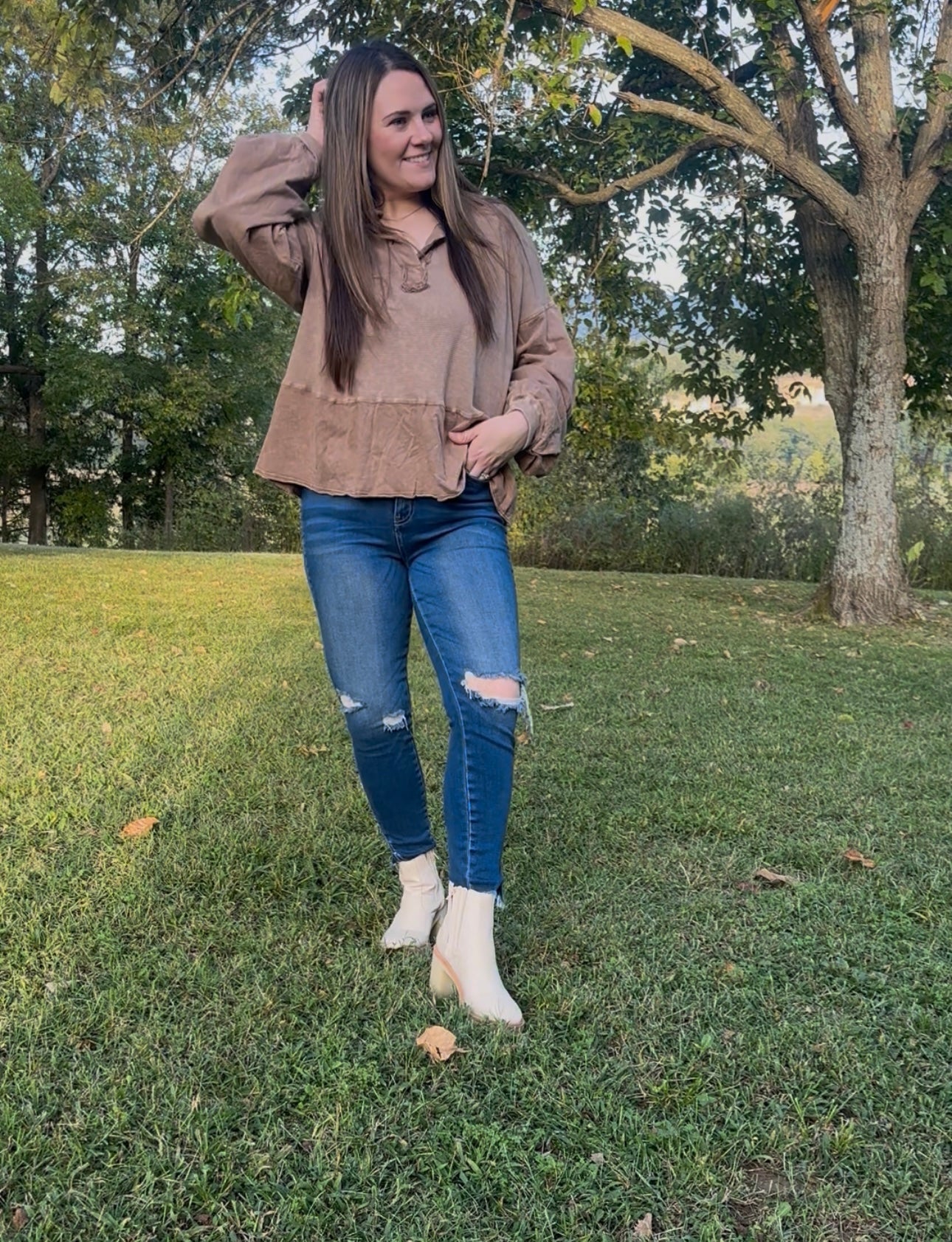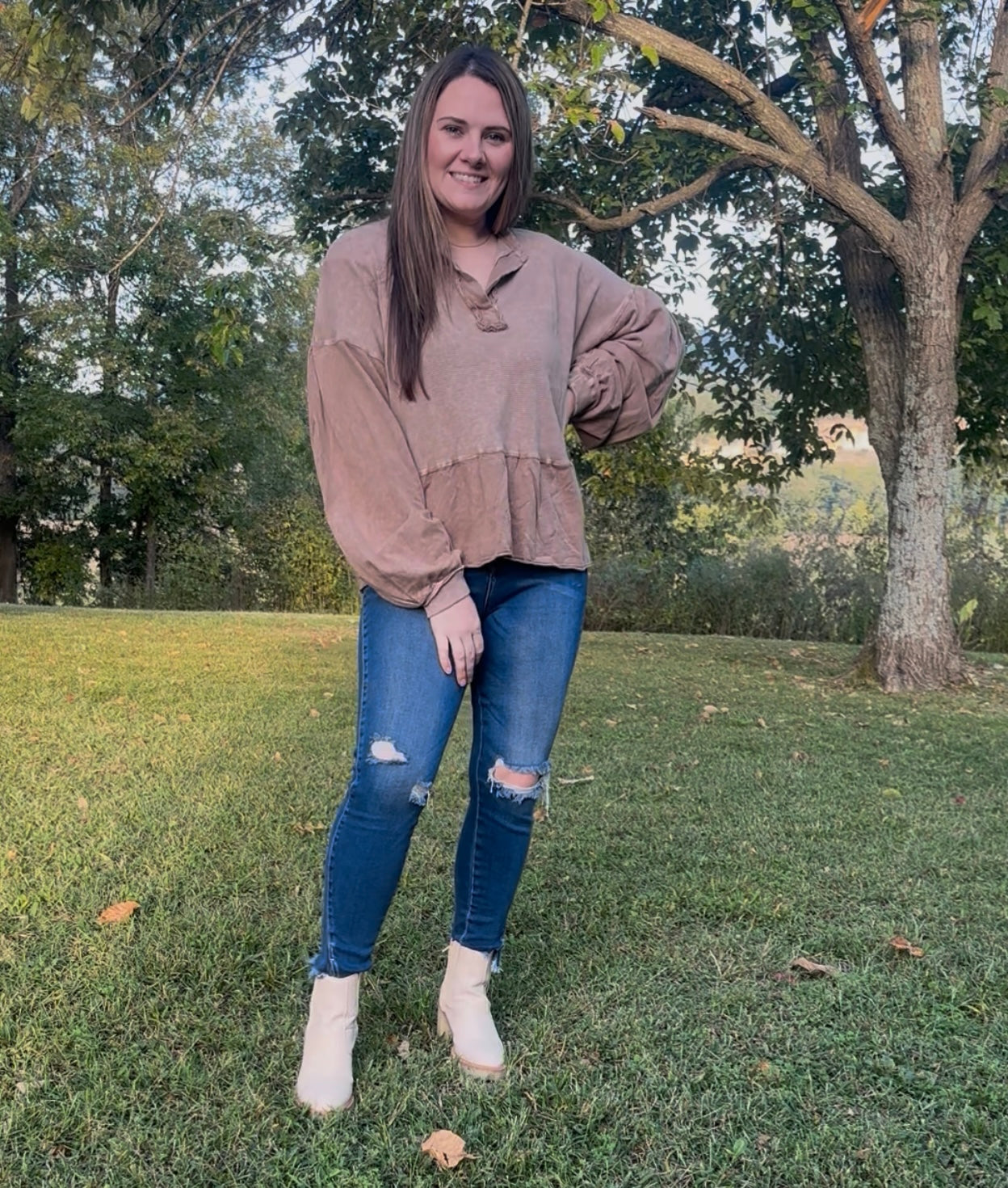 -Mineral Washed top with Vneck and Bishop sleeves and bottom detail