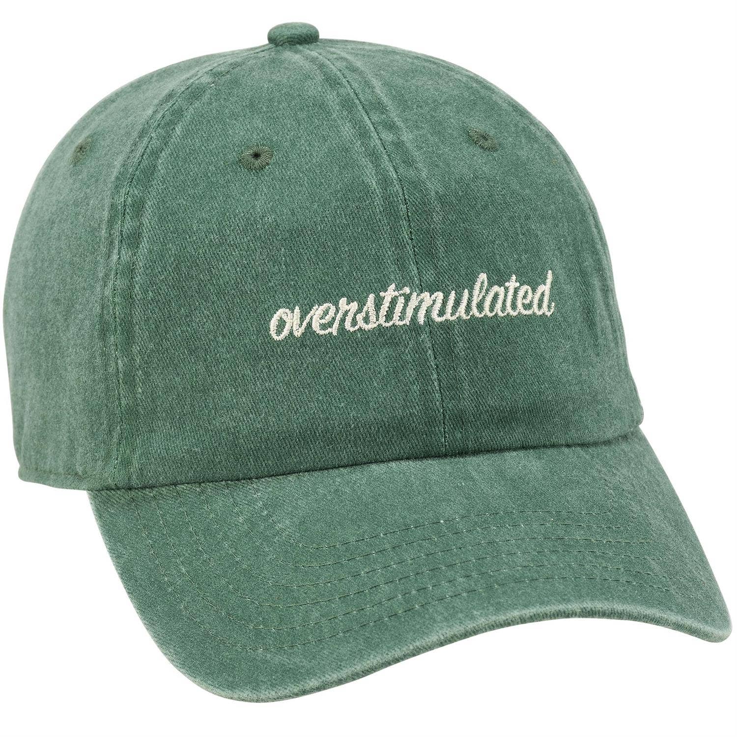 Anyone else done with keeping every little thought to themselves? Let 'em know exactly what's going on under this green baseball cap displaying a relatable sentiment that reads "overstimulated" in a hand written style for honest self-expression. Sentiment is fully embroidered on stonewashed cotton that gives a naturally worn look. Questionables baseball caps are one size fits most with an adjustable metal buckle to create the perfect fit. Hand wash only. Our Overstimulated baseball cap is perfect for everyday expression in an honest and relatable fashion.