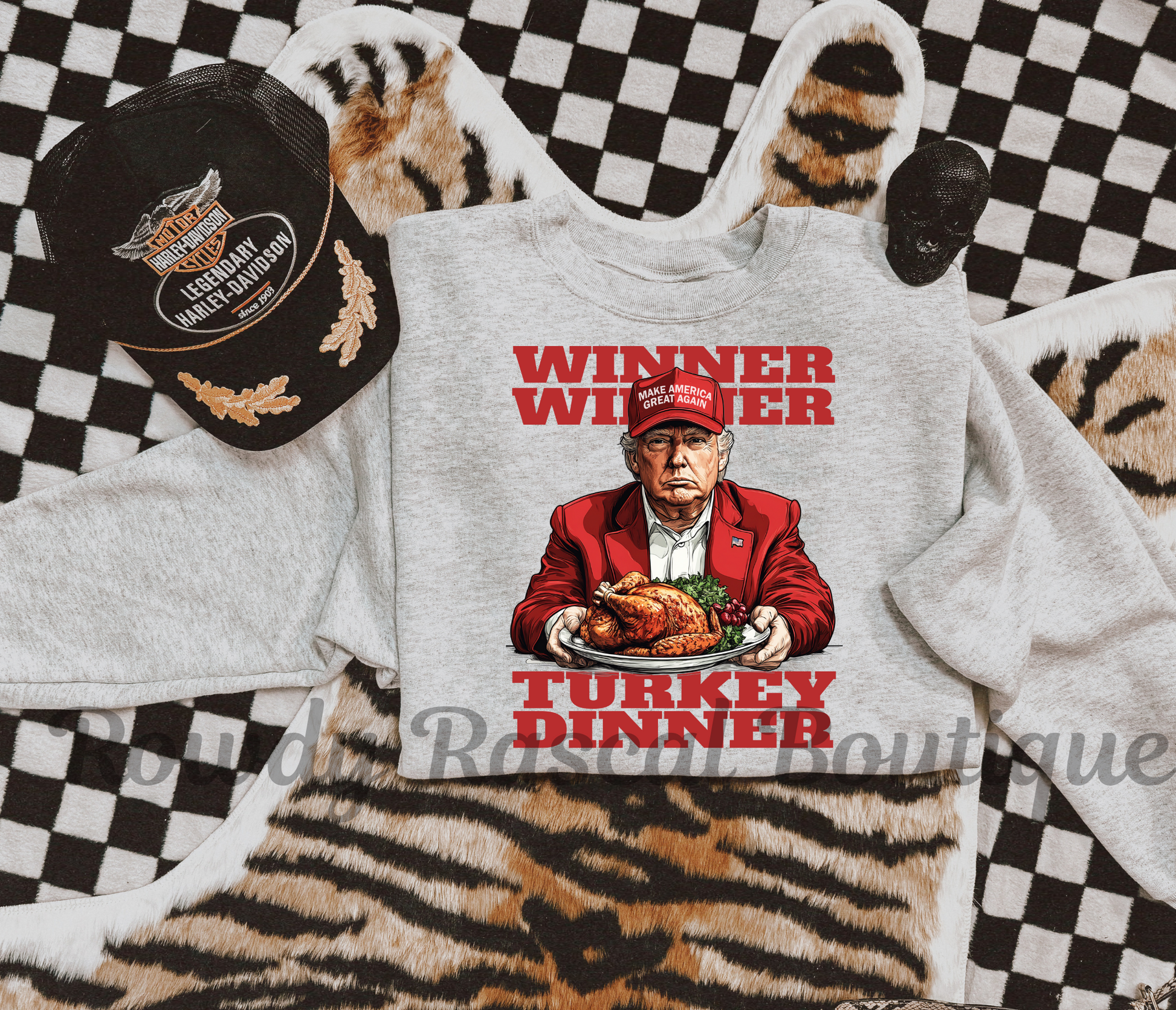 Winner Winner turkey dinner trump tee- 5 business day turn around time. Color may vary slightly due to sublimation printing.