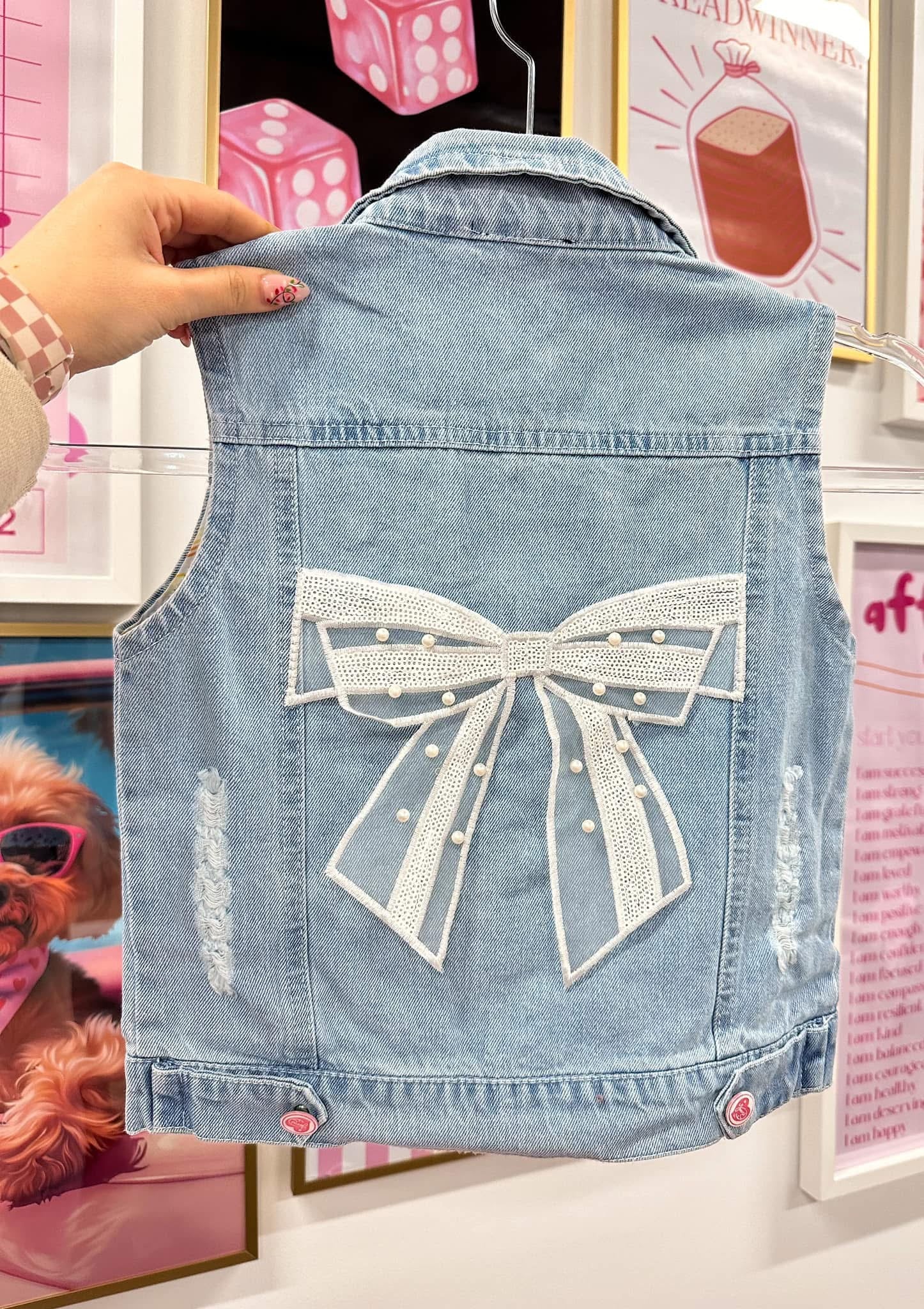 *pre claim* 2 week turnaround-This Vintage Wash Bow Pearl Vest is expertly designed with all the essential details for your little one. Made with a classic vintage wash, it adds a touch of style to any outfit. The delicate bow and pearl accents make it a versatile piece for any occasion.