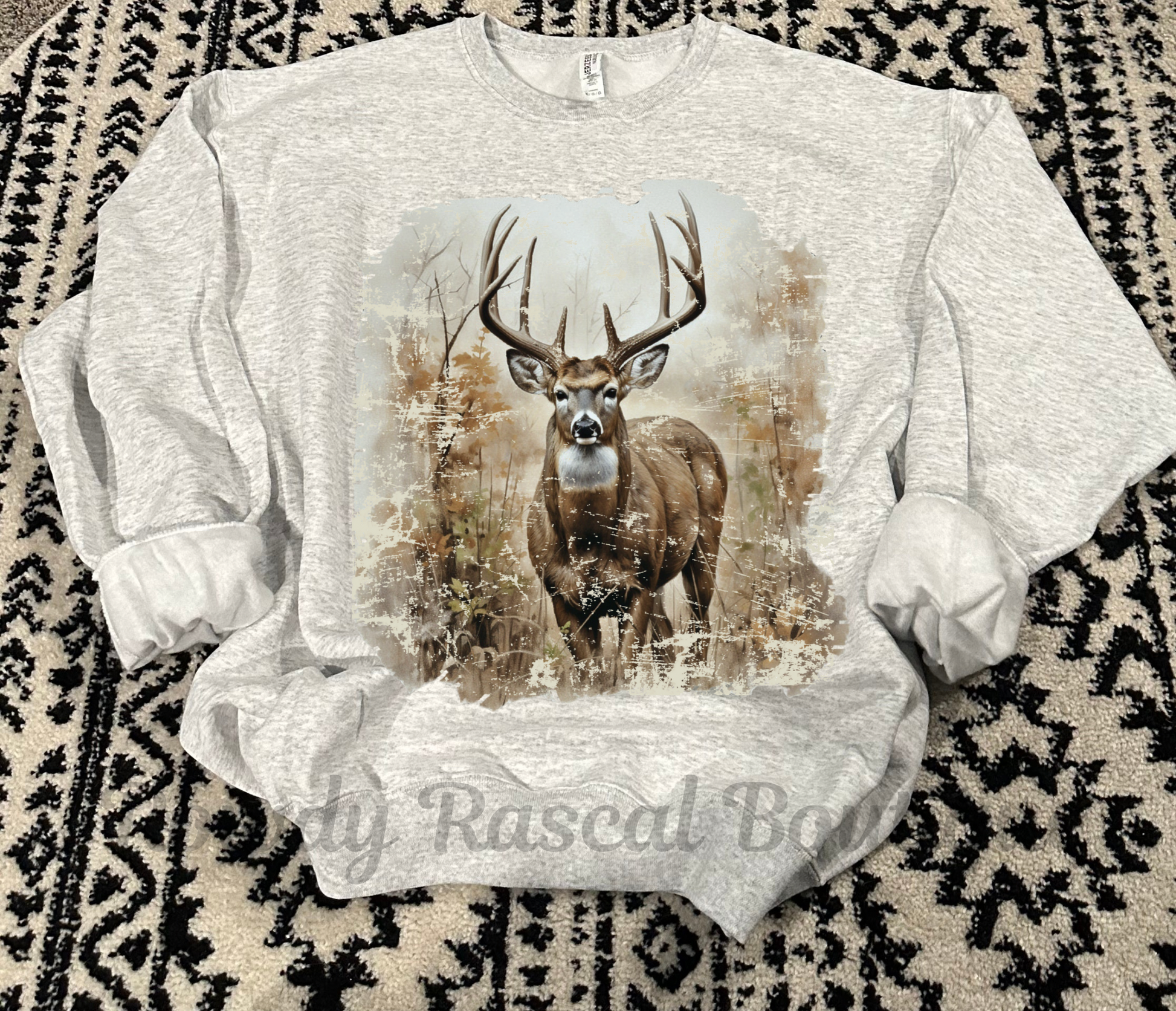 Whitetail Deer sweatshirt- infant: long sleeve romper- toddler only available in beige sweat shirt- youth only available in ash- adult available in ash or sand. 7-10bus days turn around time